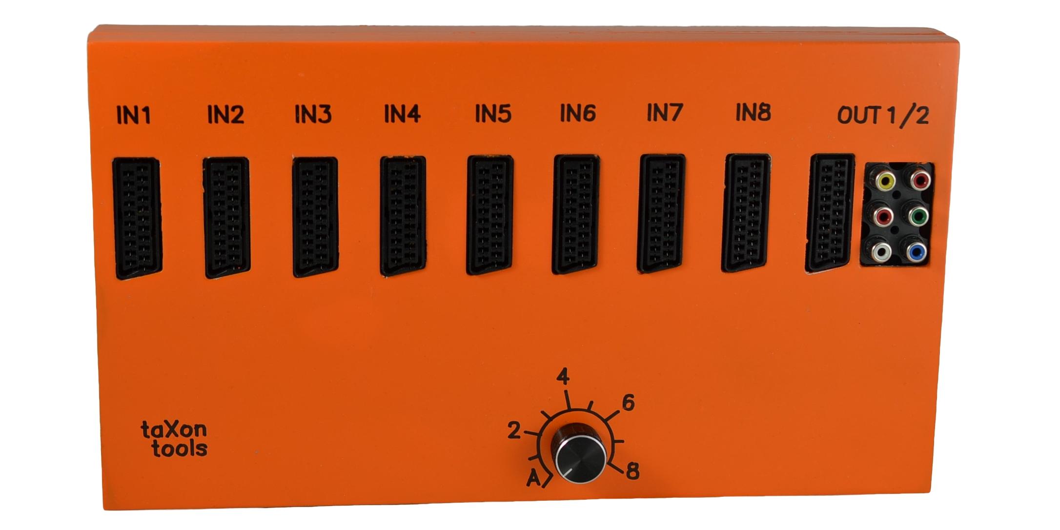 The Taxon Scart Switch makes it possible to correct wrongly wired Scart cables. Sometimes not all ground connections in the cable are correctly connected. The Taxon Scart Switch offers a common ground potential for all signals and forwards them corrected to the output device. This can lead to a better picture and sound quality with these cables.